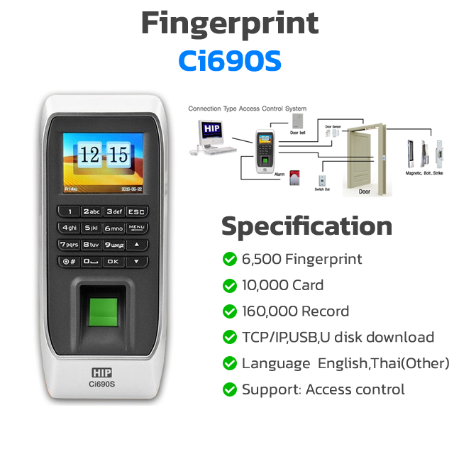 เครื่องสแกนนิ้ว-ควบคุมประตูเครื่องสแกนลายนิ้วมือ CI690S เป็นเครื่องสแกนลายนิ้วมือที่ใช้สำหรับควบคุมการเปิด-ปิดประตู และบันทึกเวลาการทำงาน ทำงานด้วยระบบ Standalone รองรับลายนิ้วมือได้สูงถึง 6,500 ลายนิ้วมือ เก็บรายการบันทึกได้สูงถึง 160,000 รายการ แสดงการทำงานด้วยจอสีให้ภาพคมชัด พร้อมทั้งสามารถดาวน์โหลดข้อมูลไปที่คอมพิวเตอร์เพื่อตรวจสอบเวลาการทำงาน หรือตรวจสอบการเข้าออกประตูผ่านทาง LAN และ USB Flash Drive และ เครื่องสแกนลายนิ้วมือ CI690S ยังมีระบบ Anti-Pass Back เพื่อเพิ่มความปลอดภัยอีกด้วย