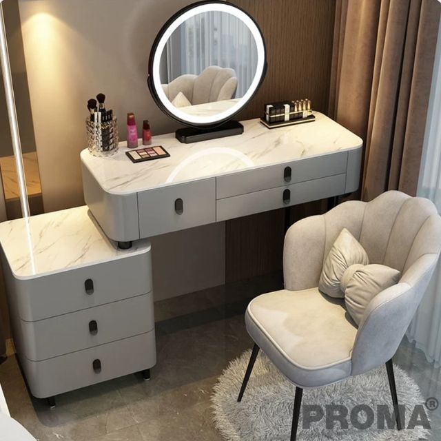 นอกจากเตียงนอนแล้ว โต๊ะแต่งหน้าพร้อมที่นั่ง โต๊ะเครื่องแต่งหน้า คืออีกหนึ่งเฟอร์นิเจอร์ที่จำเป็นสำหรับห้องนอน ห้องแต่งตัว ใช้สำหรับเก็บเครื่องสำอาง หรือเครื่องประดับ ซึ่งโต๊ะแต่งหน้ามีบทบาทในชีวิตประจำวันของเราตั้งแต่ตื่นจนถึงเข้านอน ช่วยให้คุณแต่งหน้าแต่งตัวได้อย่างสะดวกสบาย อีกทั้งยังยกระดับห้องนอน ห้องแต่งตัวของคุณให้สวยอย่างมีระดับ ด้วยโต๊ะเครื่องแป้งท็อปหินอ่อน มาพร้อมกับเก้าอี้หนัง และลิ้นชักเก็บของหลายช่อง มีกระจกทรงกลมตัดด้วยขอบทองดูหรูหรา มีไฟ LED แบบทัชสกรีน สีขาว สวยงามดีไซน์หรูหราจาก Proma