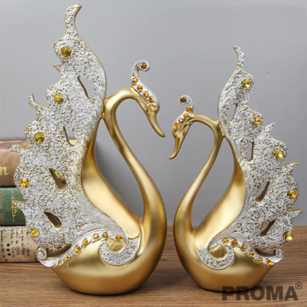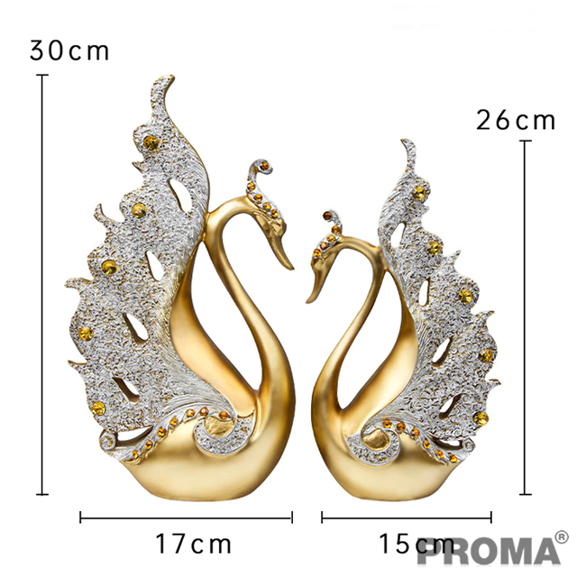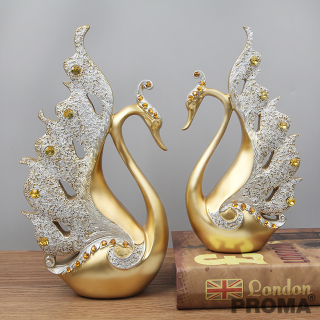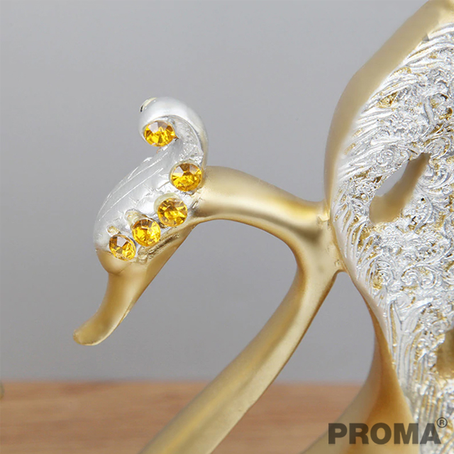 รูปปั้นเรซิ่น หงส์คู่สีทองประดับคริสตัลสีอำพัน
