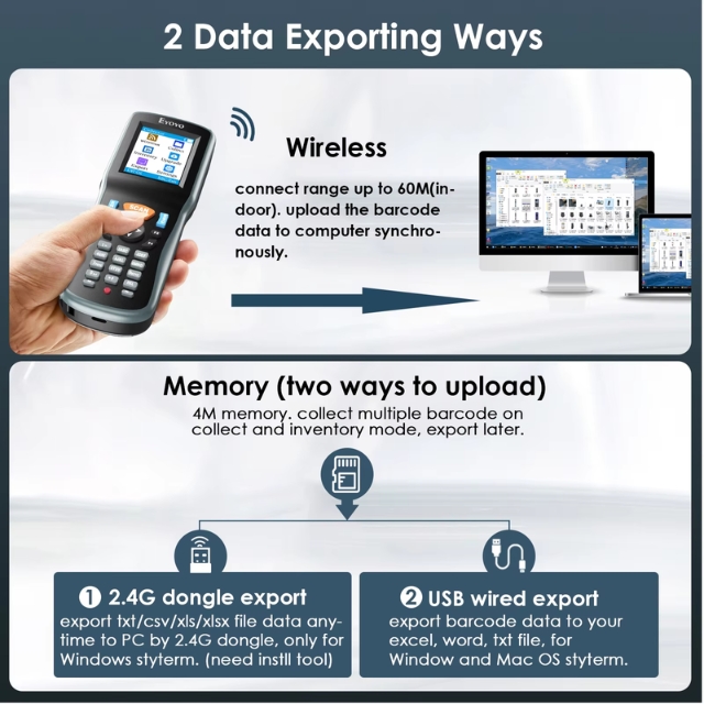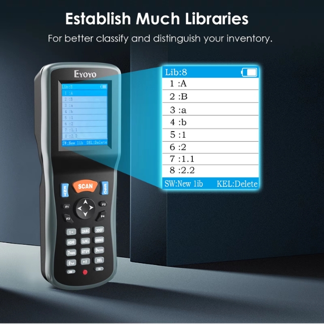 เครื่องสแกนบาร์โค้ดไร้สาย 1D 2D Eyoyo เครื่องสแกนบาร์โค้ดแบบพกพาสำหรับเก็บข้อมูลแบบพกพาพร้อมตัวรับ USB และหน้าจอ LCD สี TFT ขนาด 2.2 นิ้ว เครื่องอ่านบาร์โค้ดแบบพกพาสำหรับร้านค้า ซูเปอร์มาร์เก็ต และคลังสินค้า เครื่องสแกนแบบพกพา Eyoyo รุ่นใหม่ผสมผสานเครื่องสแกนบาร์โค้ดไร้สาย เครื่องรวบรวมบาร์โค้ด และเครื่องนับสินค้าคงคลังเพื่อทำหน้าที่รับข้อมูลบาร์โค้ด ด้วยหน้าจอมอนิเตอร์ขนาด 2.2 นิ้ว สามารถตรวจสอบเนื้อหาบาร์โค้ด ประเภท จำนวน และความยาวได้ เสียบแล้วใช้งานได้เลย พร้อมตัวรับ USB การส่งสัญญาณไร้สายที่ยาวนานขึ้น