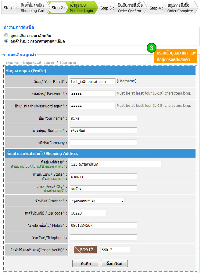 3. ลงทะเบียนสมาชิก พร้อมกรอกที่อยู่ในการจัดส่ง สำหรับลูกค้าใหม่ จากนั้นคลิกปุ่ม "บันทึก"