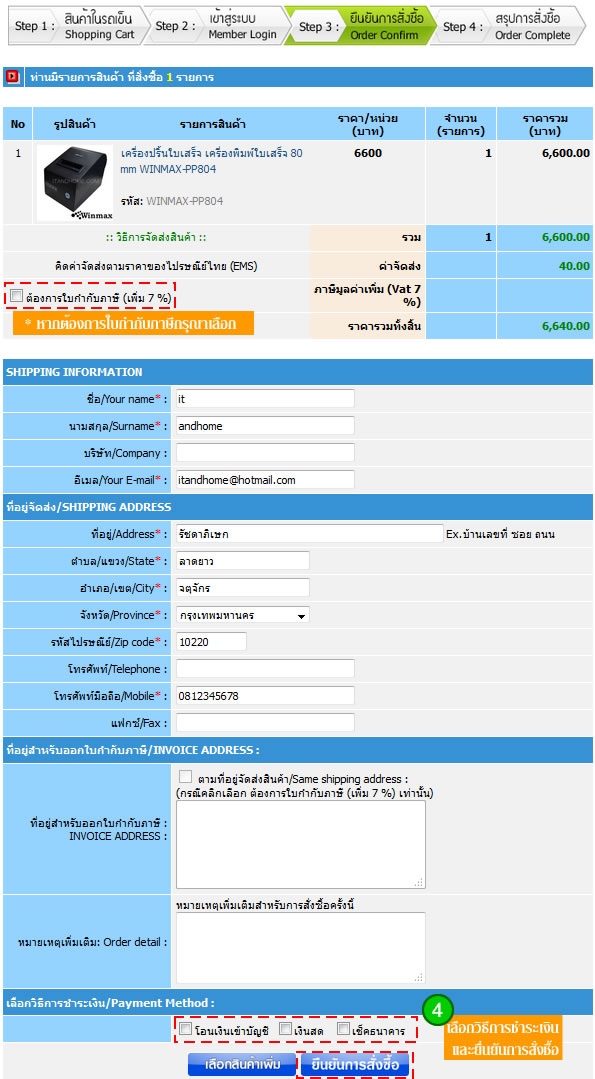 4. ต้องการ Vat 7% หรือไม่ เลือกวิธีการชำระเงิน ตรวจสอบข้อมูลให้ถูกต้อง จากนั้นคลิกปุ่ม "ยืนยันการสั่งซื้อ"