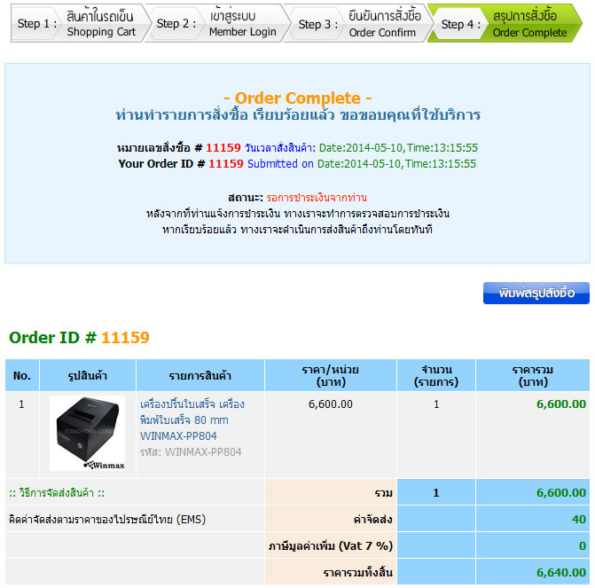 5. ได้รับหมายเลขการสั่งซื้อ และแสดงรายการสินค้าพร้อมจำนวนเงิน แล้วทำการชำระเงินตามวิธีที่เลือกไว้