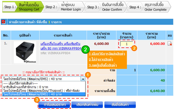 2. เลือกวิธีการจัดส่ง และใส่จำนวนสินค้า จากนั้นคลิกปุ่ม "ทำใบเสนอราคา"