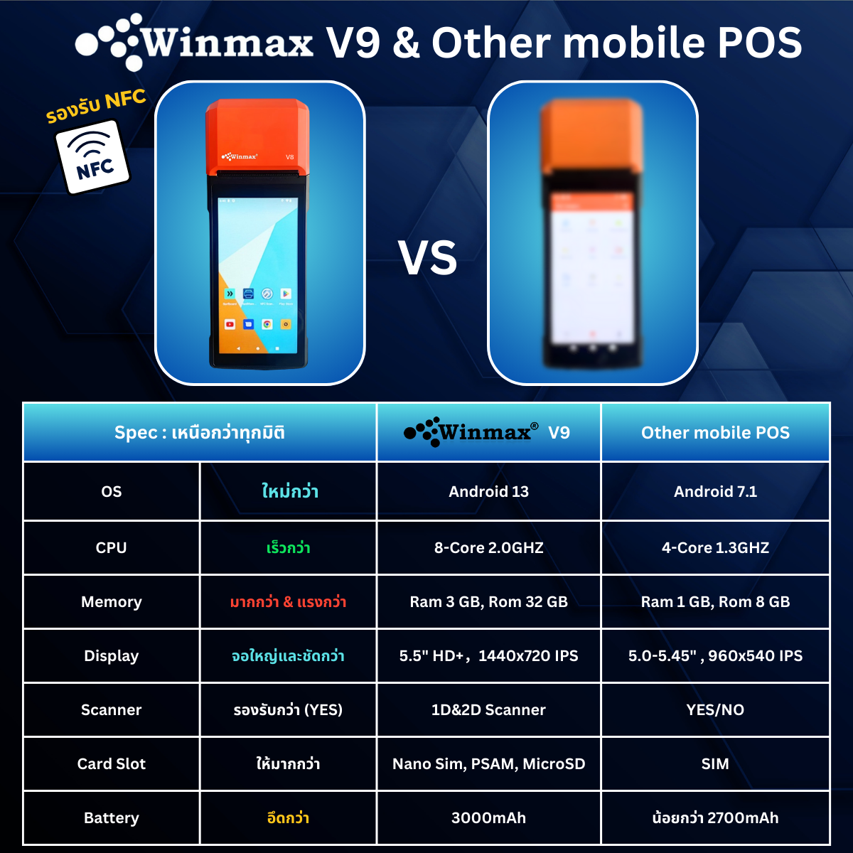 เครื่องขายหน้าร้าน ขายผ่านแอพเดลิเวอรี่ Android POS แบบพกพา พร้อมเครื่องพิมพ์ใบเสร็จ+NFC ในตัว โปรแกรม POS ฟรี ไม่มีรายเดือน Winmax-V9