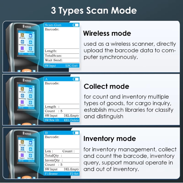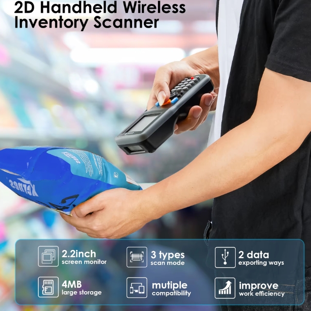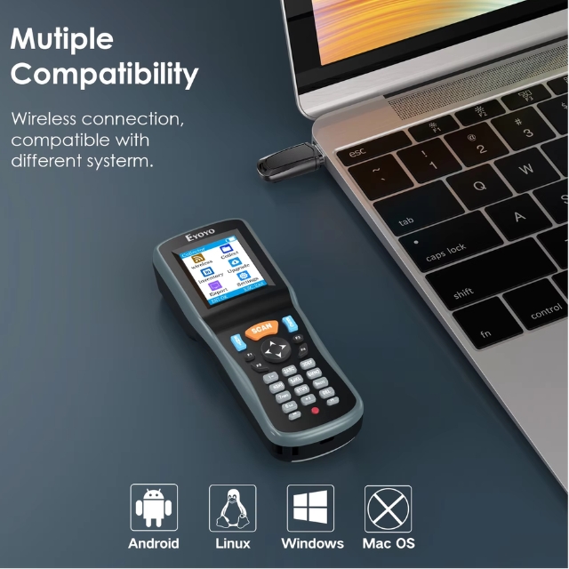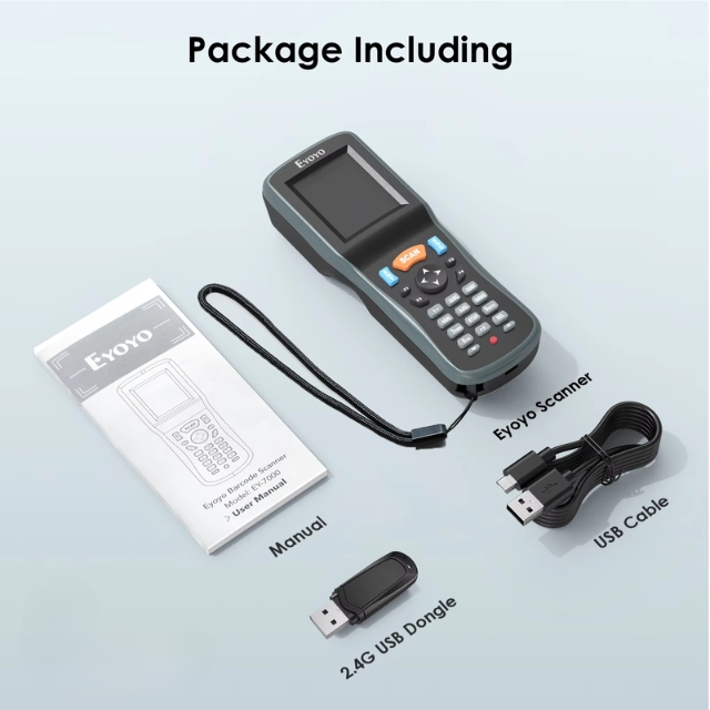 เครื่องสแกนบาร์โค้ดไร้สาย 1D 2D Eyoyo เครื่องสแกนบาร์โค้ดแบบพกพาสำหรับเก็บข้อมูลแบบพกพาพร้อมตัวรับ USB และหน้าจอ LCD สี TFT ขนาด 2.2 นิ้ว เครื่องอ่านบาร์โค้ดแบบพกพาสำหรับร้านค้า ซูเปอร์มาร์เก็ต และคลังสินค้า เครื่องสแกนแบบพกพา Eyoyo รุ่นใหม่ผสมผสานเครื่องสแกนบาร์โค้ดไร้สาย เครื่องรวบรวมบาร์โค้ด และเครื่องนับสินค้าคงคลังเพื่อทำหน้าที่รับข้อมูลบาร์โค้ด ด้วยหน้าจอมอนิเตอร์ขนาด 2.2 นิ้ว สามารถตรวจสอบเนื้อหาบาร์โค้ด ประเภท จำนวน และความยาวได้ เสียบแล้วใช้งานได้เลย พร้อมตัวรับ USB การส่งสัญญาณไร้สายที่ยาวนานขึ้น