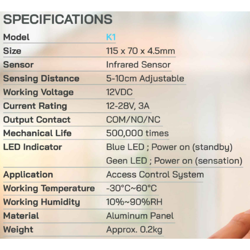HIP Exit Switch รุ่น K1 เป็นปุ่มกดขาออกแบบไร้สัมผัส ซึ่งเป็นอุปกรณ์เสริมที่สำคัญสำหรับระบบ Access Control ควบคุมการเปิด-ปิดประตูอย่างมีประสิทธิภาพ สะดวกสบาย และช่วยลดการสัมผัสเพื่อป้องกันการแพร่เชื้อโรค